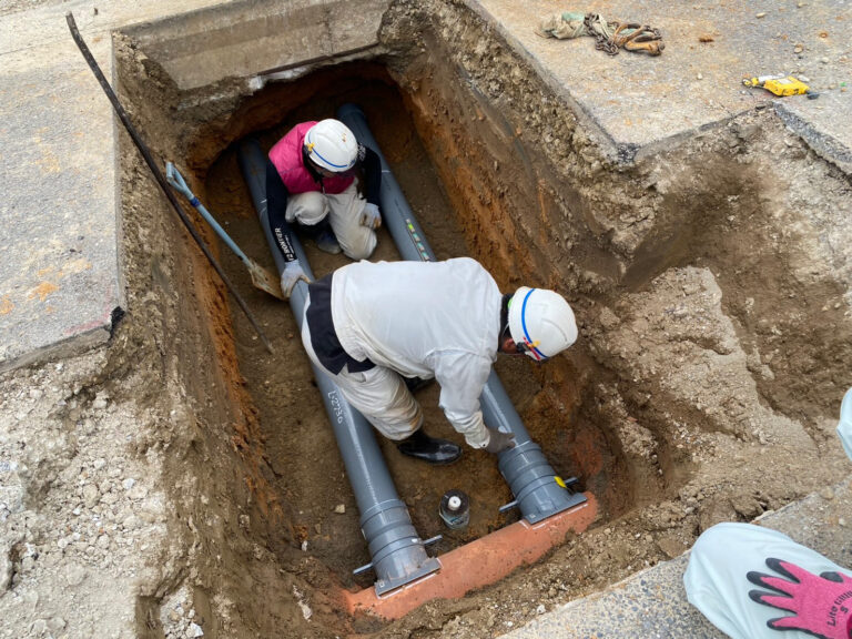 水道本管布設替工事 水道用ポリエチレン管や水道用ダクタイル鋳鉄管を使用し、水道本管を新しくしました。綺麗な水を安定して届けるために、一本一本人の手でつなげています。